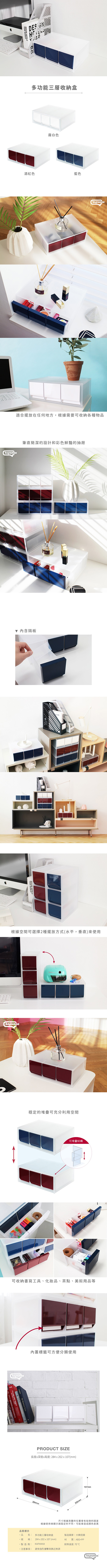 多功能三層收納盒擁有筆直簡潔的設計,內含隔板,適合擺放在任何地方。根據需要可收納各種物品, 例如:書寫工具、化妝品、茶點和美術用品等。收納盒可穩固的堆疊,充分利用空間根據空間可選擇二種擺放方式(水平,垂直)來使用。品牌地 韓國製造地 韓國尺寸 284x202x107mm材質 HIPS
