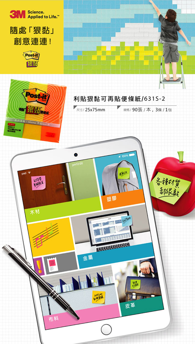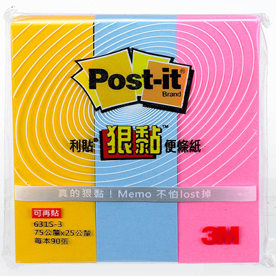 3M 思高牌 Post-it 631S-3狠黏利貼黃.藍.粉75*25mm