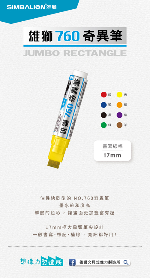 產品特色奇異筆的墨水飽和度比較高,屬油性快乾型,用以一般書寫、標記都相當好用,不建議用來做大面積著色,17mm極大扁頭筆尖設計,可畫粗細面,畫面呈現更加豐富有趣,加上豐富鮮艷的色彩,更多配色變化與創作空間。產品用途美工設計專用。手繪海報、廣告、壁報、金屬、木材、玻璃表面記號用