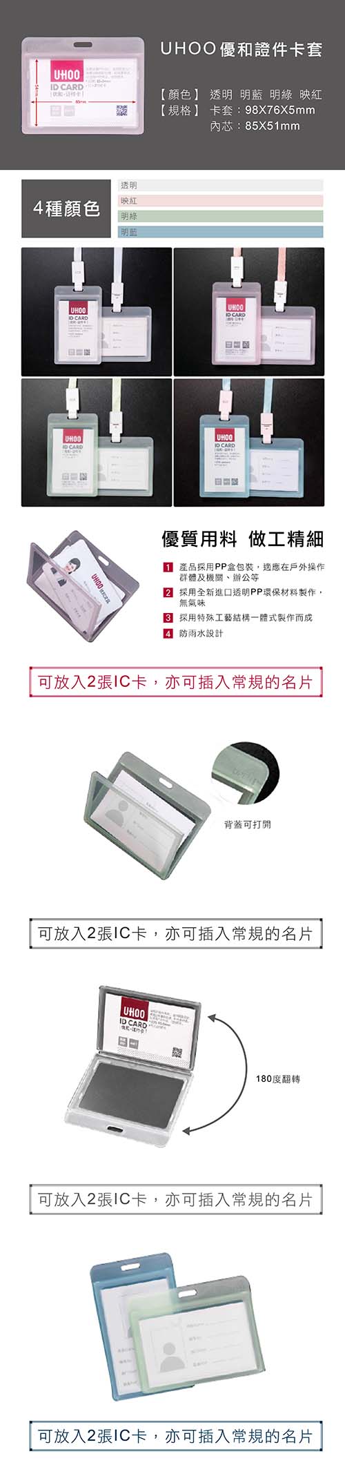 內徑85X54mm.可裝2片IC卡適用 : UHOO 識別證件寬版掛繩/識別帶/吊繩 11534#、UHOO 識別證件多彩掛繩/識別帶/吊繩 11501#由於商品為塑膠製品、若有嚴重挑剔有塑膠味問題、則不建議購買。