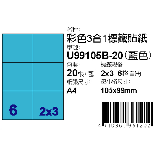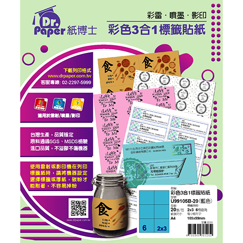 Dr.Paper 105x99mm NO.6-U99105B-20 6格 藍 A4 雷射噴墨影印自黏標籤貼紙/電腦標籤 20大張入