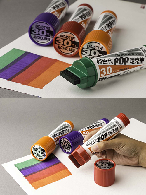 利百代 907-30 酒精性POP嘜克筆採用30mm的平方尖筆尖,一筆畫下更寬更有氣勢,寫大型看板、指標POP,非它不可。紅、橙、黃、綠、藍、紫、茶、黑8種鮮明飽滿的基本色,宛如彩虹更勝彩虹,是美工設計、學校壁報、營業與活動現場的必備秘密武器。