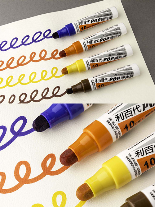 利百代907-10酒精性POP嘜克筆採用10mm的圓尖筆尖,筆觸穩定平順而有力,書寫圓體字、繪製圖案與插畫最為出色。這款嘜克筆共有紅、橙、黃、綠、藍、紫、茶、黑8種基本色,使用筆尖保濕性佳的酒精性墨水,不僅色彩鮮明且隨時都能保持出水流暢,是美術設計、美工陳列等專業人士畫海報、寫POP的首選。
