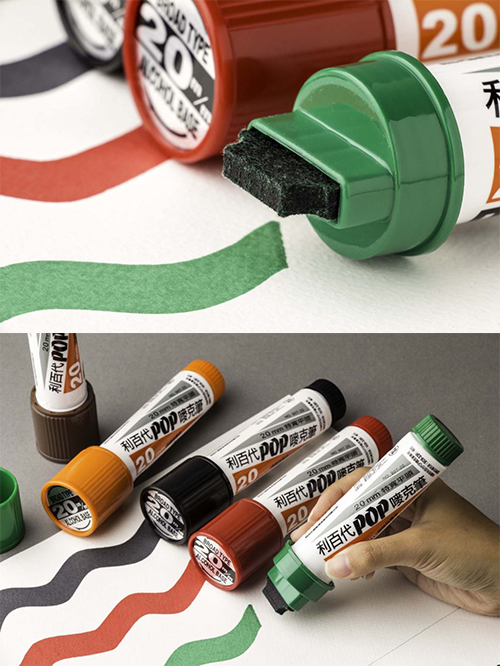 利百代 907-20 酒精性POP嘜克筆採用20mm的特寬平頭平方尖筆尖,筆觸飽滿有力,寫大字報就靠這一支,握在手裡超有FU!紅、橙、黃、綠、藍、紫、茶、黑8種鮮明的基本色彩,是美工設計、繪製壁報、賣場POP最佳利器。
