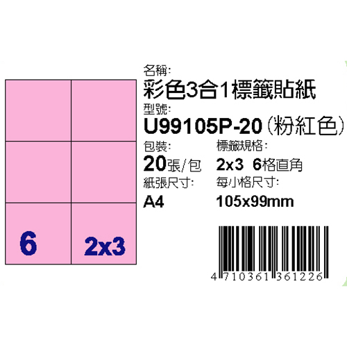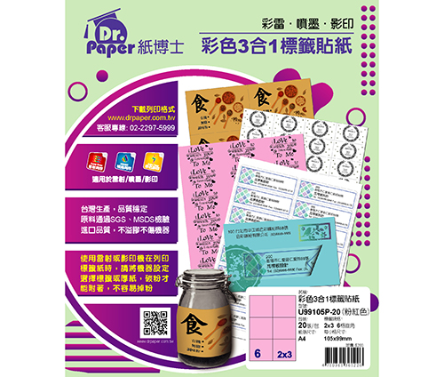 Dr.Paper 105x99mm NO.6-U99105P-20 6格 粉紅 A4 雷射噴墨影印自黏標籤貼紙/電腦標籤 20大張入