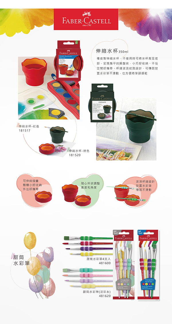 濕性顏料創作必備水杯特色橡皮製伸縮水杯不使用時可將水杯壓至底部,呈現扁平的圓盤狀小巧好收納、不佔空間好攜帶杯緣波浪紋路設計,可穩固放置水彩筆不滑動,也方便將筆頭順乾 進口商品貨源較不穩定,可先來電或來信洽詢是否有存貨。版面款式也可能因為國外廠商異動、下訂前也可先行確認、恕不另行通知。