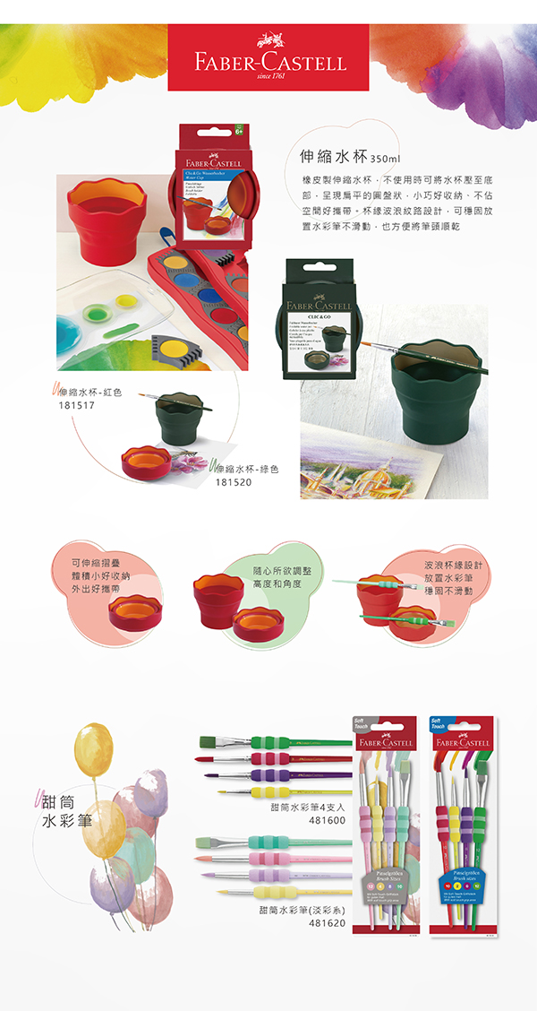 濕性顏料創作必備水杯特色橡皮製伸縮水杯不使用時可將水杯壓至底部,呈現扁平的圓盤狀小巧好收納、不佔空間好攜帶杯緣波浪紋路設計,可穩固放置水彩筆不滑動,也方便將筆頭順乾 進口商品貨源較不穩定,可先來電或來信洽詢是否有存貨。版面款式也可能因為國外廠商異動、下訂前也可先行確認、恕不另行通知。