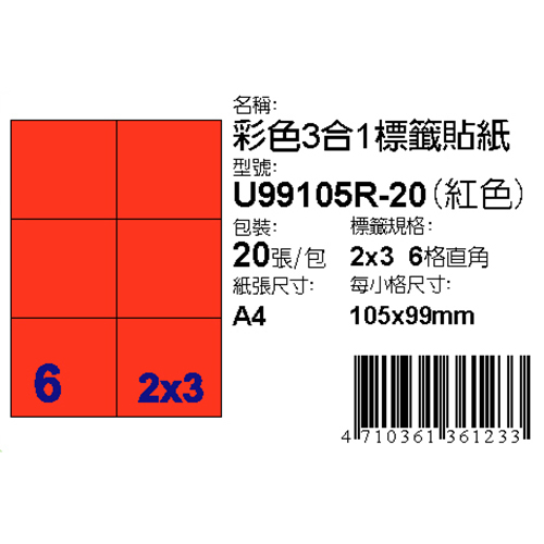 Dr.Paper 105x99mm NO.6-U99105R-20 6格 紅 A4 雷射噴墨影印自黏標籤貼紙/電腦標籤 20大張入