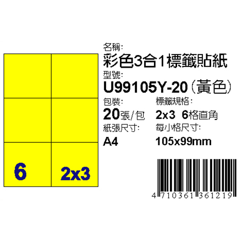 Dr.Paper 105x99mm NO.6-U99105Y-20 6格 黃 A4 雷射噴墨影印自黏標籤貼紙/電腦標籤 20大張入