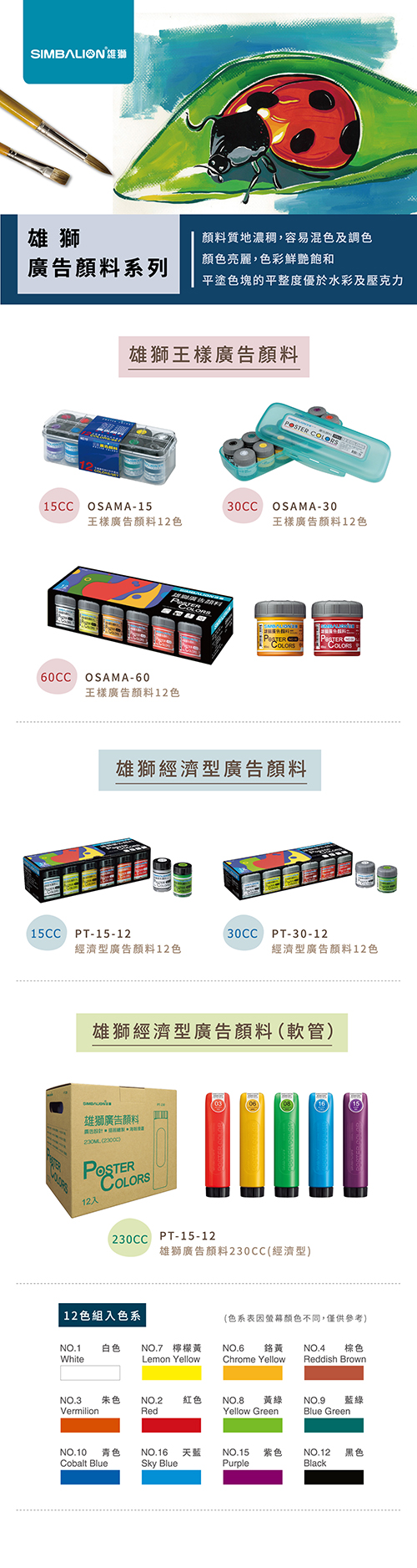 產品說明廣告顏料色彩鮮豔,平塗容易,是平面設計族的最愛,且經濟實惠的價格讓人更輕鬆無負擔,滿足各個族群的創作渴望,讓大人小孩都能畫得安心,玩得更開心。產品用途適用於美工繪製、漫畫插圖、廣告設計,滿足各個族群的創作渴望。