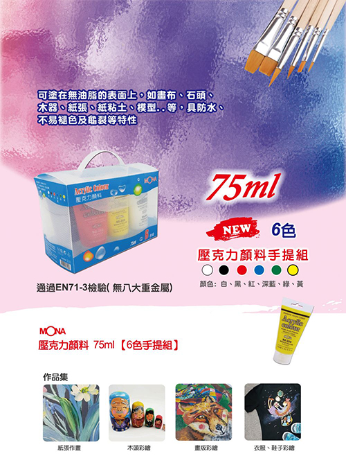 * 覆蓋力強、附著力佳、色彩飽和度、延展性及鮮豔度良好* 可塗於無油脂的表面上.如石頭、畫布、木器、塑膠、紙張、紙粘土、模型...等.所有想的到的材質上* 簡單方便無毒.乾後不溶於水也不褪色,龜裂等特性。