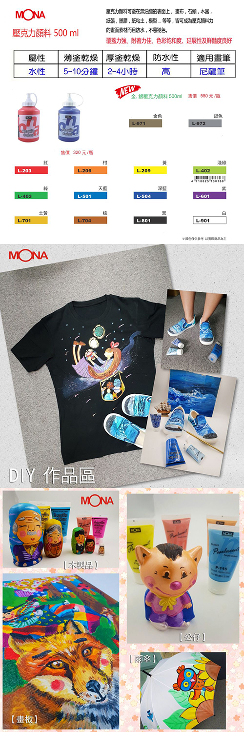 * 覆蓋力強、附著力佳、色彩飽和度、延展性及鮮豔度良好* 可塗於無油脂的表面上.如石頭、畫布、木器、塑膠、紙張、紙粘土、模型...等.所有想的到的材質上* 簡單方便無毒.乾後不溶於水也不褪色,龜裂等特性。