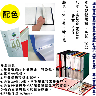 產品型號規格:B20 (A4) 配色尺寸:高:308 寬:236背寬15mm顏色:紅、藍、綠、黑產品特色:1.無毒環保PP材質製造,可回收、無毒。2.直式A4規格。3.附背條袋可標示說明。4.內頁20張40面,內頁壓花可直接影印。5.內頁PP袋與外板以超音波結合方式結合,加強內頁袋與板片的堅固效果。6.PP板厚度 0.7mm。