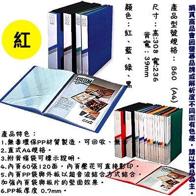 產品型號規格:B60 (A4) 紅尺寸:高:308 寬:236背寬39mm顏色:紅、藍、綠、黑產品特色: 1.無毒環保PP材質製造,可回收、無毒。2.直式A4規格。3.附背條袋可標示說明。4.內頁60張120面,內頁壓花可直接影印。5.內頁PP袋與外板以超音波結合方式結合,加強內頁袋與板片的堅固效果。6.PP板厚度 0.7mm。