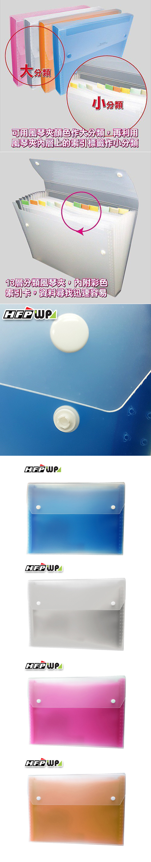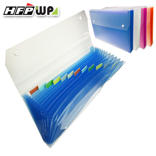 產品特性:1.無毒環保PP材質,可回收、無毒。2.12格A4橫式規格。3.彩色內頁可作大分類。4.內附彩色索引方便資料整理歸檔取用。5.採雙鈕扣設計,開關容易。6.內頁加強,板片內有凹槽設計,可當筆座用。產品規格:尺寸: 高:240 寬:330 背寬:32mm顏色:紅、藍、白、桔