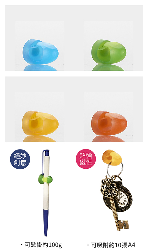 產品特色 :1卡4顆可懸掛約100G生活小物可吸附約10張A4影印紙軟性橡膠材質.不傷吸附物表面• 軟性橡膠材質,不傷吸附物表面• 磁性超強,可吸附約10張A4影印紙(70g/m²)• 創意掛勾設計,可懸掛約100g生活小物• 可吸附於冰箱、OA隔板、磁性白板⋯等鐵磁表面上使用