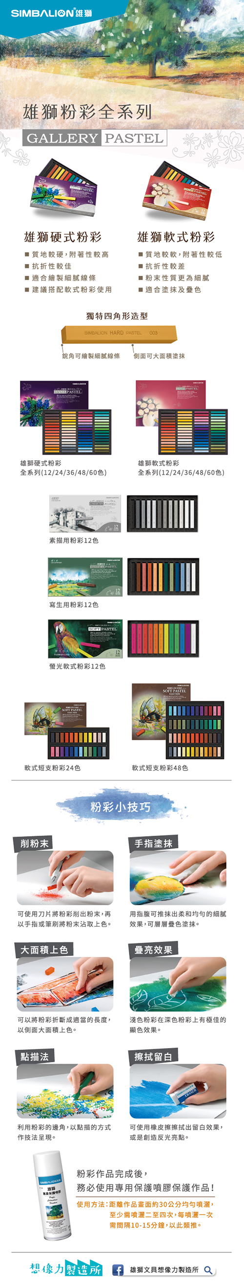 相當適合小朋友使用,讓粉彩繪畫不再是專家人士的專利,連小朋友也可以運用自如、享受粉彩繪畫的樂趣!可使用於繪畫彩色素描及更細膩的粉彩作品,搭配軟式粉彩一併使用,將有豐富多層次效果。不但可以畫粉彩,也可以當成色鉛筆、蠟筆使用!