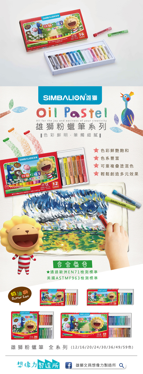 粉蠟筆的顏色飽和、色彩鮮明,並可以重複塗抹在同一個地方,作出不同的層次感,更因為油水相斥的原理,可以搭配水彩或墨汁的使用,將多樣化素材混合後製造出令你意想不到的效果。【雄獅粉蠟筆】全系列皆採用安全無毒配方,並通過美國AP及歐洲CE安全檢驗認證。絕對讓您買得安心,用得更放心!