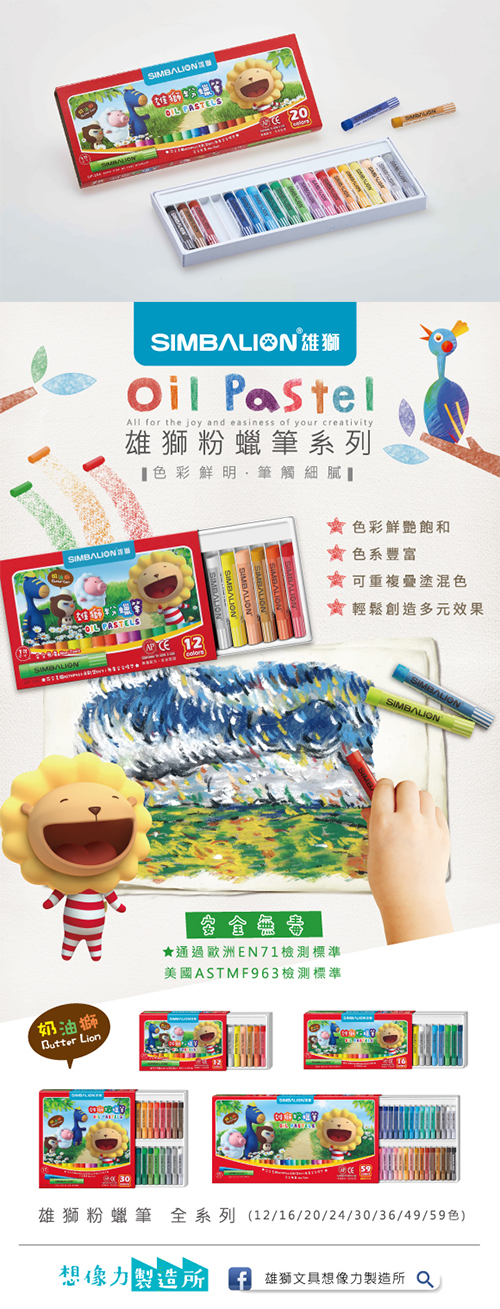 設計師將奶油獅的朋友們,亮麗曝光於【雄獅粉蠟筆】上,讓可愛趣味的奶油獅家族陪您彩繪無限想像!色彩美豔飽和的亮麗粉蠟筆系列,可以重複塗抹在同一個地方,作出不同的層次感,更因為油水相斥的原理,可以搭配水彩或墨汁的使用,將多樣化素材混合後製造出令你意想不到的效果。除此之外,更可利用重色混合、拖色的繪畫技巧,營造作品的立體感,呈現出油畫的效果。