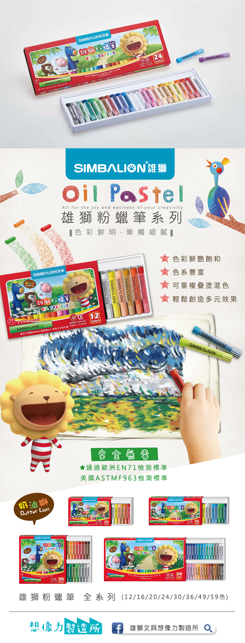 設計師將奶油獅的朋友們,亮麗曝光於【雄獅粉蠟筆】上,讓可愛趣味的奶油獅家族陪您彩繪無限想像!色彩美豔飽和的亮麗粉蠟筆系列,可以重複塗抹在同一個地方,作出不同的層次感,更因為油水相斥的原理,可以搭配水彩或墨汁的使用,將多樣化素材混合後製造出令你意想不到的效果。除此之外,更可利用重色混合、拖色的繪畫技巧,營造作品的立體感,呈現出油畫的效果。