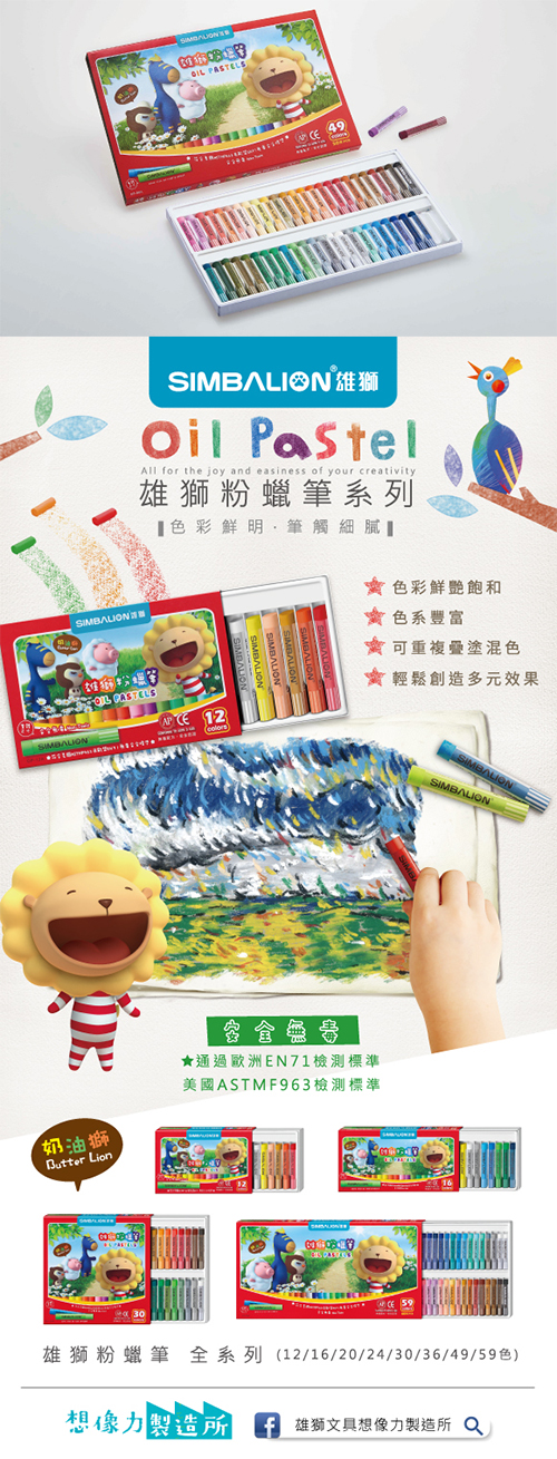 粉蠟筆的顏色飽和、色彩鮮明,並可以重複塗抹在同一個地方,作出不同的層次感,更因為油水相斥的原理,可以搭配水彩或墨汁的使用,將多樣化素材混合後製造出令你意想不到的效果。【雄獅粉蠟筆】全系列皆採用安全無毒配方,並通過美國AP及歐洲CE安全檢驗認證。絕對讓您買得安心,用得更放心!