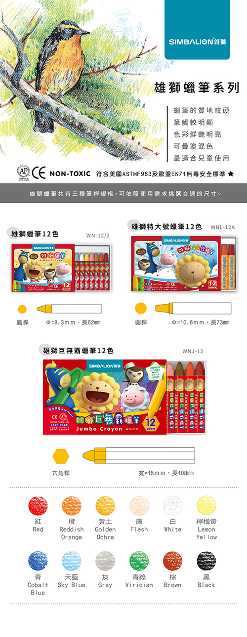 SIMBALION 雄獅 WNL12A 特大蠟筆 12色 φ10.6×73mm