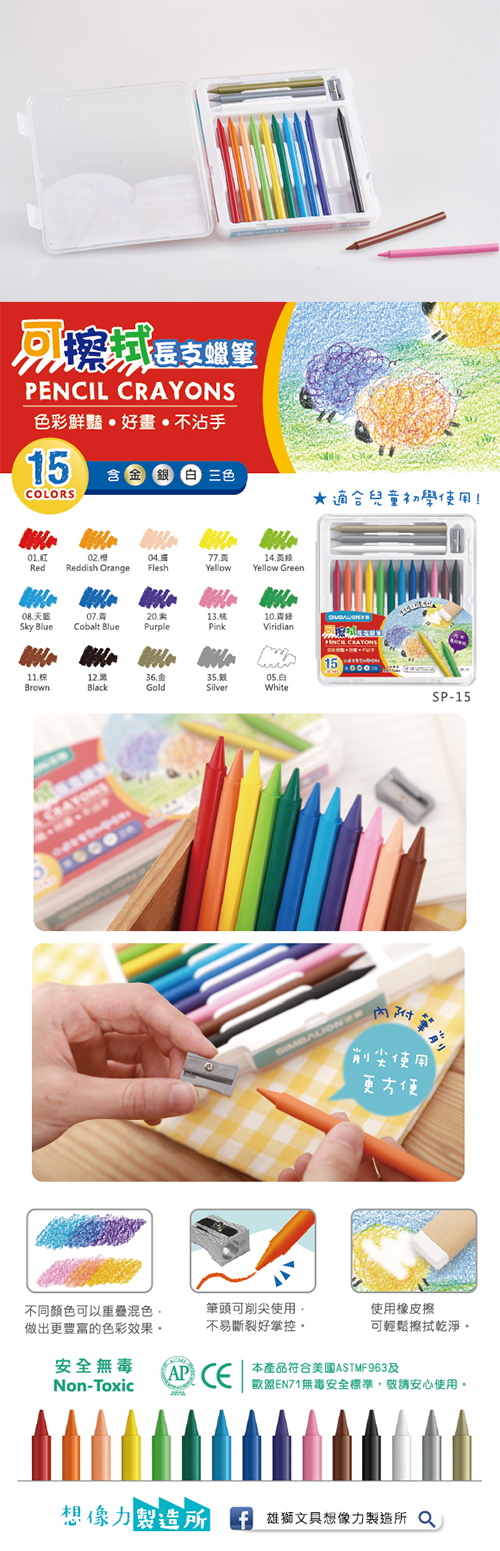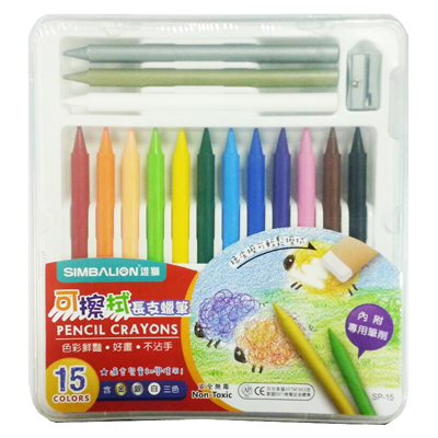SIMBALION 雄獅 SP15 可擦拭長支塑盒蠟筆 15色