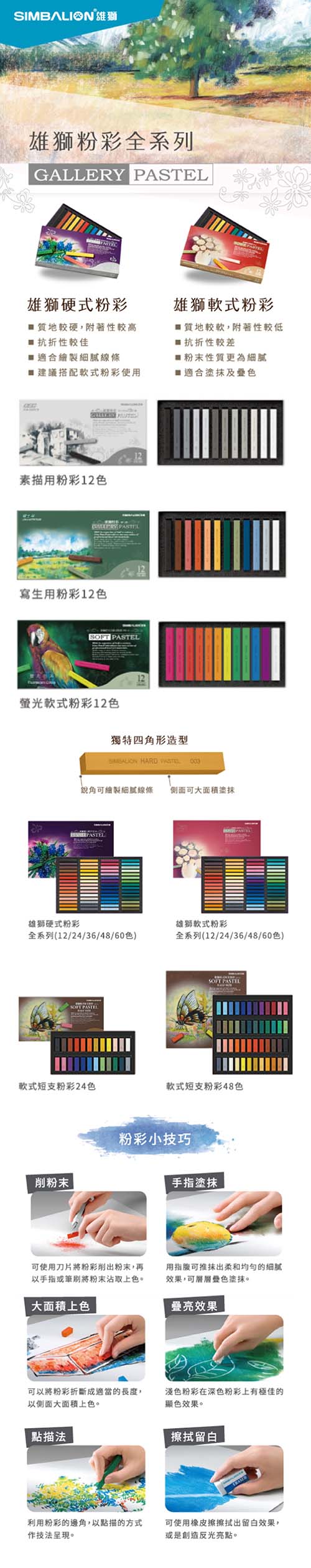 相當適合小朋友使用,讓粉彩繪畫不再是專家人士的專利,連小朋友也可以運用自如、享受粉彩繪畫的樂趣!可使用於繪畫彩色素描及更細膩的粉彩作品,搭配軟式粉彩一併使用,將有豐富多層次效果。不但可以畫粉彩,也可以當成色鉛筆、蠟筆使用!