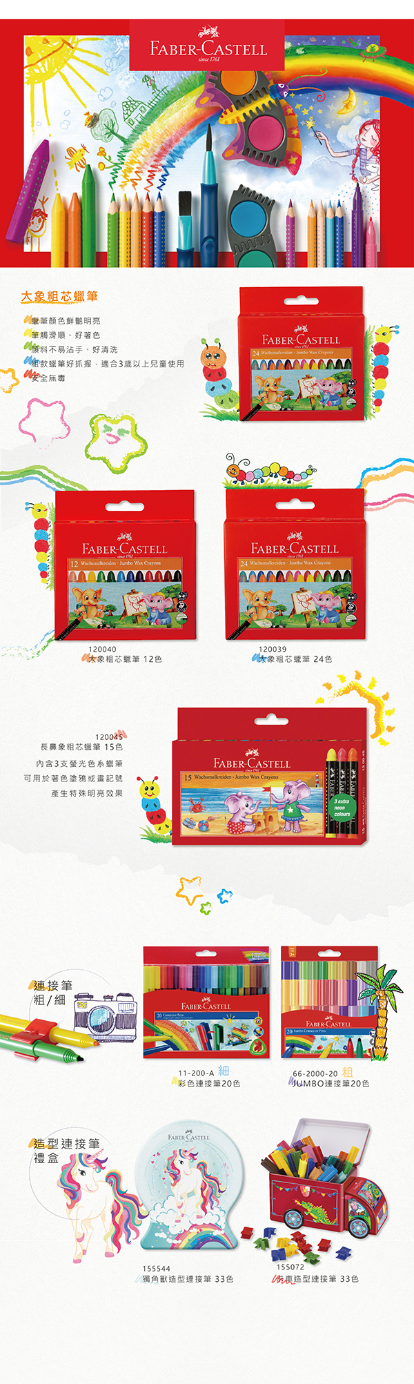 特色蠟筆顏色鮮艷明亮筆觸滑順、好著色顏料不易沾手、好清洗粗款蠟筆好抓握,適合3歲以上兒童使用,安全無毒進口商品貨源較不穩定,可先來電或來信洽詢是否有存貨。版面款式也可能因為國外廠商異動、下訂前也可先行確認、恕不另行通知。