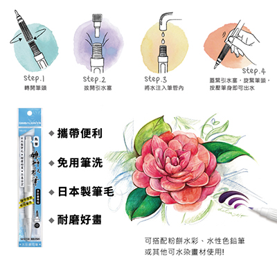 採日本製筆毛,耐磨好用且攜帶便利,可搭配粉餅水彩、水性色鉛筆等可水染畫材使用!
