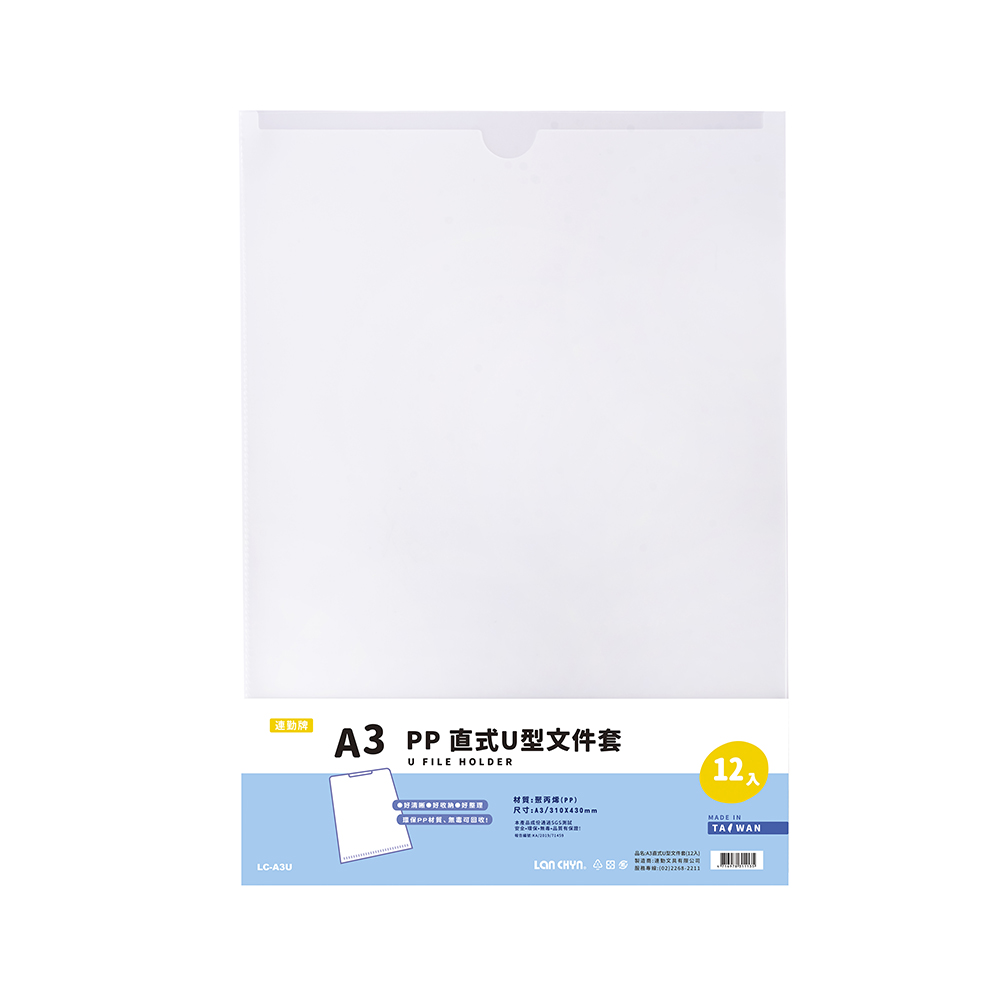 LC-A3U PP直式透明A3 U型文件袋/文件夾 白色透明 12入/每包