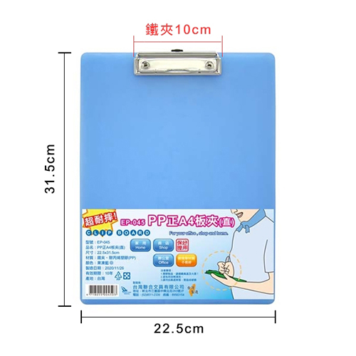 WIP台灣聯合 正A4 PP直式板夾 (不易碎) NO.EP-045S