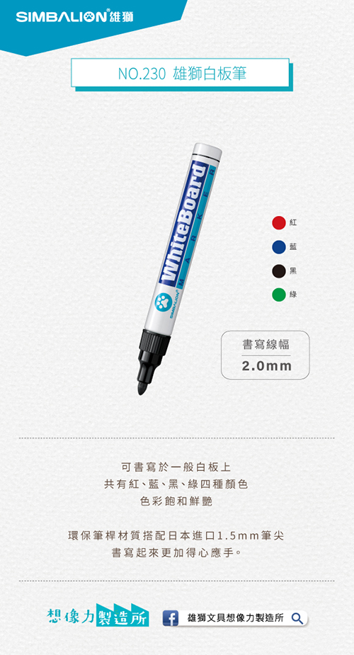 適用 : 雄獅 白板筆補充水 NO.230R產品特色 :可書寫於一般白板上,共有紅、藍、黑、綠四種顏色,色彩飽和鮮艷,環保筆桿材質搭配日本進口1.5mm筆尖,書寫起來更加得心應手。產品說明 :白板筆可反覆書寫於可擦拭的塑膠製白色平面板,常用於課堂教學、會議討論、與個人記事等用途。