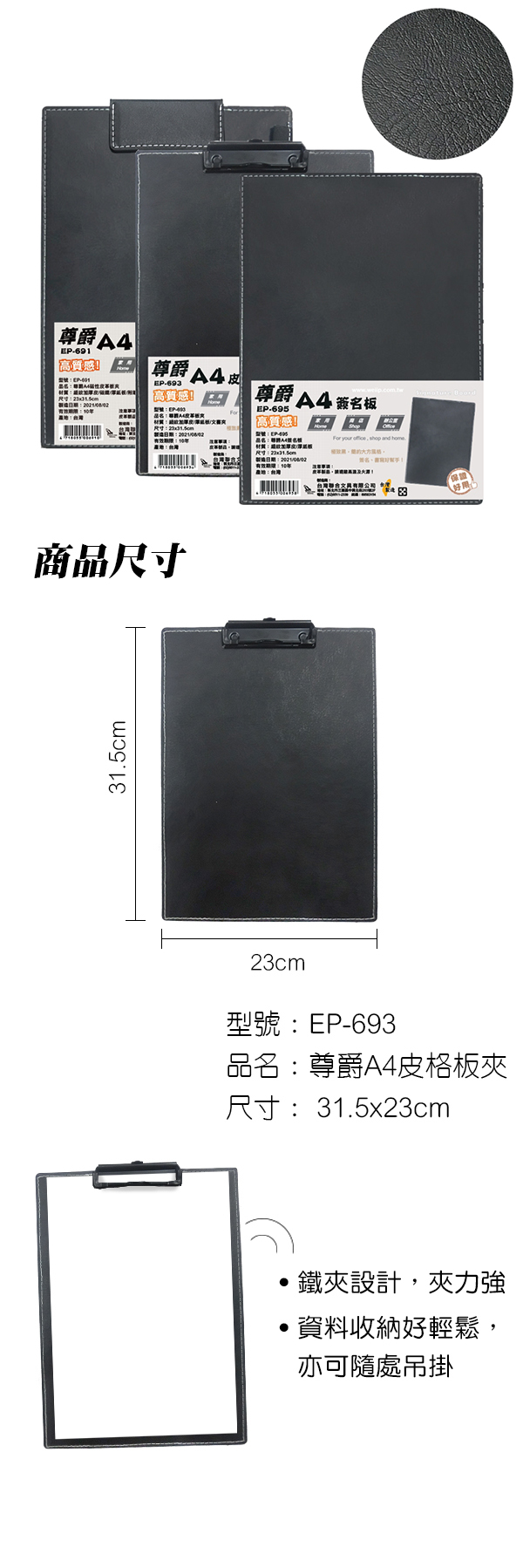 WIP台灣聯合 尊爵A4皮革板夾230x315mm直式 NO.EP-693