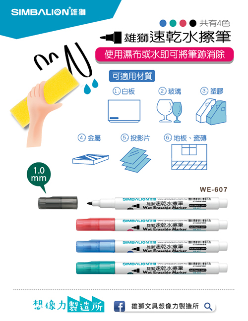 產品說明 :速乾水擦筆採用獨家研發配方書寫筆跡速乾,顏色鮮明清楚,平面光滑的材質表面上作記號標示、書寫及彩繪,想去除筆跡時,只要使用濕布或清水就能完全清除筆跡產品用途 :可用於白板、玻璃、塑膠、金屬、投影片、地板及磁磚等平面光滑的材質表面上作記號標示、書寫及彩繪,想去除筆跡時,只需使用一般清水或濕布便能輕鬆洗淨,完全不留痕跡。
