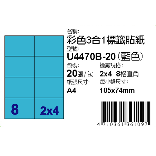 Dr.Paper 105x74mm NO.8-U4470B-20 8格 藍 A4 雷射噴墨影印自黏標籤貼紙/電腦標籤 20大張入