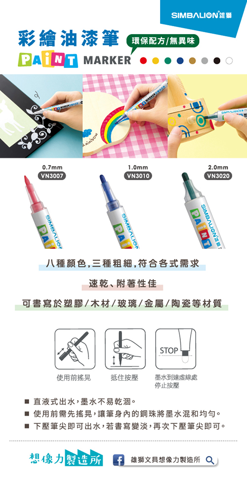 超神【雄獅彩繪油漆筆】採用酒精性環保顏料製作而成,擁有如同油漆般的遮蔽性,並俱備耐水、速乾的優點,而且顏色固著性好,色彩鮮豔不褪色,絕對是創意達人也為之讚嘆的完美彩繪工具!